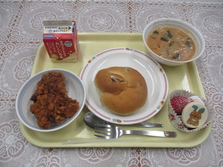 ☆トマトクリームスープ ☆ぶどうパン ☆ロックチキン ☆バナナブラウニー ☆牛乳 でした。