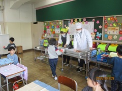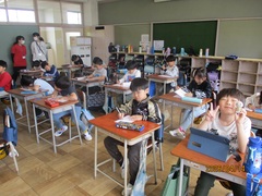 幼稚園・保育園でも給食の配膳はしていたことと思いますが、来週からは配膳をがんばります。「いただきます」の後は、最初にストローを牛乳に差し込みます。ストローについている袋をストローの真ん中に残して差し込みます。これがなかなか難しく、四苦八苦していましたが、できた後は本当においしそうに食べていました。ぜひお家で感想を聞いてあげてください。