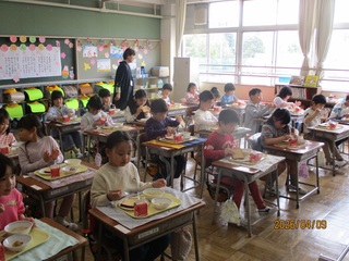 1年生は、昨日牛乳だけを飲みました。そして、今日から完全給食がスタートしました。