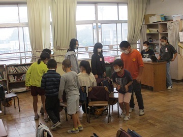 登校班ごとに各教室にわかれ、ハンカチ落としや爆弾ゲームなどを楽しんでいました。