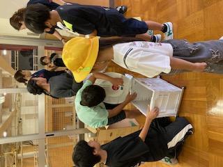 小ホールでは、羽田特別出張所の方から、避難所設営を学びます。段ボールベッド、防災トイレを組み立てます。段ボールから出して、力を合わせて組み立て、寝てみたり座ってみたり。片付けもします。こどもたちは、あっという間にマスターしていました。