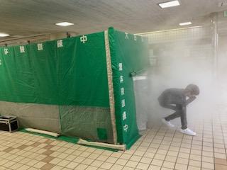 煙ハウスの中はけむりでいっぱい。前が見えません。なので、壁をさわりながら進みます。毛布担架は初めての試みです。一枚の毛布で人を安全に運ぶ方法です。人形は地域の方が2体つくってくれました。あまりに人間そっくりなので、びっくりしていました。脇のところをくるくる巻いて、しっかりつかんで運びます。