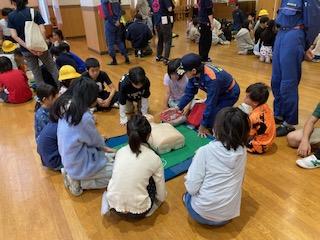 ランチルームでは救命救急です。心臓マッサージ、AED。知っていること、やったことがあるということはとても大きなことです。AEDは場所を知って、運んでくることも大事な仕事。小さな学年も、小さい手で一生懸命心臓マッサージにチャレンジしました。