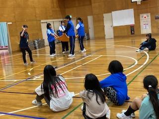 毛布担架です。羽田中学校から4名、ボランティアが来てくれました。