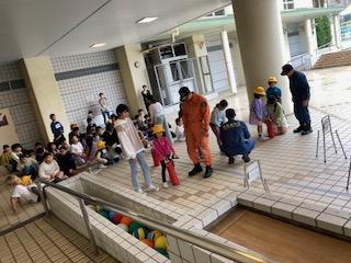 朝から冷たい雨が降っていました。雨のため、校庭で行う予定の消火器訓練は、ピロティで行いました。ピンを抜き、的に向かってレバーを引いていきます。低学年の子を優先的に体験しました。