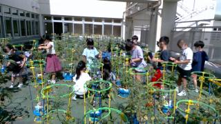 4月から、ミニトマト、なす、きゅうり、おくら、ピーマン、枝豆を畑とプランターで育てています。今年は、大豊作で、きゅうりとなすがたくさんできました。野菜を育てることで、虫たちも畑に集まり、生き物の観察も楽しめました。