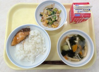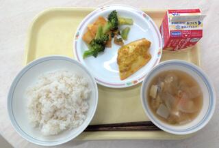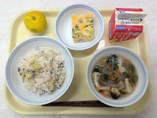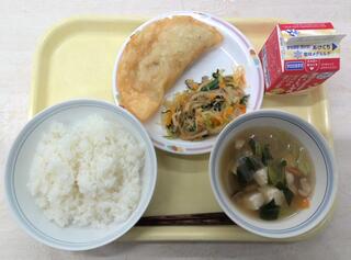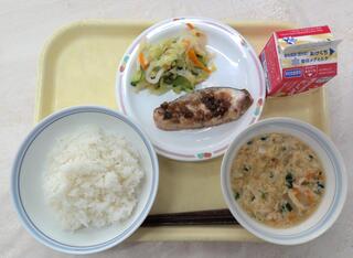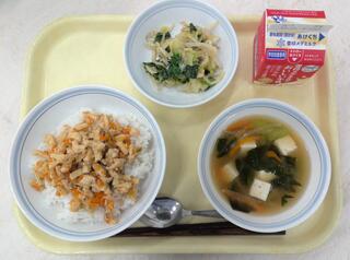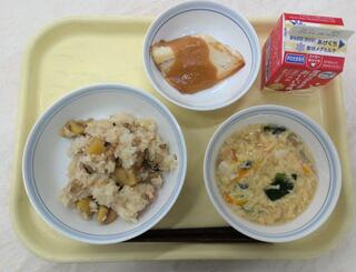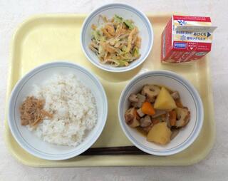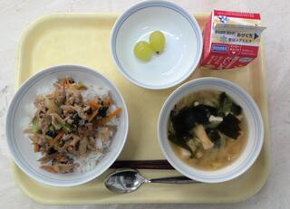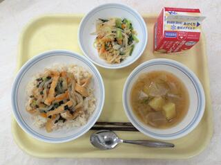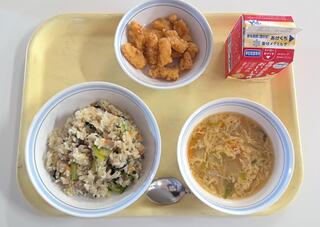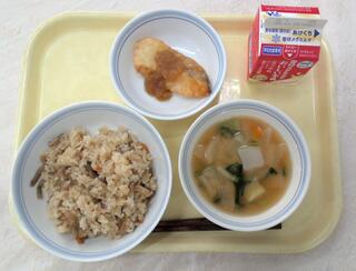 とり肉とごぼうのごはん 魚のおろしソースかけ 呉汁 牛乳
