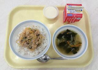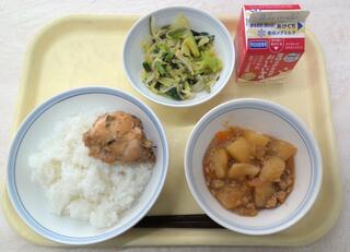 ごはん 鶏のごまだれ焼き 茎わかめと野菜の和え物 じゃがいものそぼろ煮 牛乳