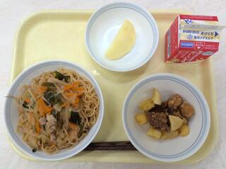 炒めそばの豚肉あんかけ ビーンズポテト 梨 牛乳