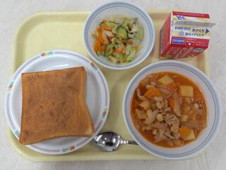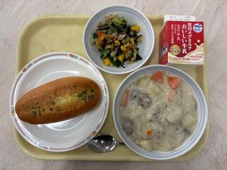 ヨーグルトフレンチトースト クリームシチュー オニオンドレサラダ 牛乳