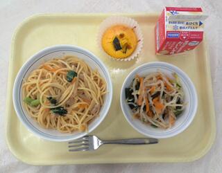 鶏肉とごぼうのスパゲティ わかめサラダ パンプキンケーキ 牛乳