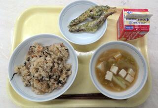 ひじきごはん ししゃもの磯辺揚げ のっぺい汁 牛乳