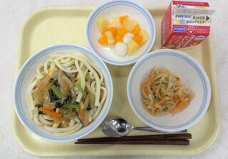 カレーうどん 大根サラダ フルーツ白玉ポンチ 牛乳