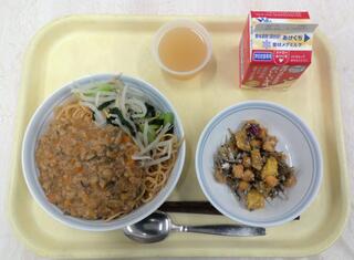 ジャージャー麺 大豆と小魚の変わり揚げ ピーチゼリー 牛乳