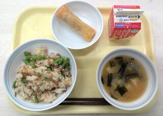 とり肉野菜飯 きのこ春巻き みそ汁 牛乳
