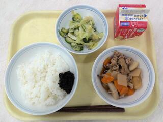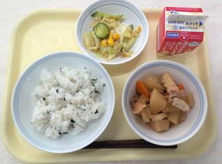 こぎつねごはん とり肉と野菜の煮物 大根サラダ 牛乳