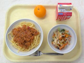 スパゲティ大豆入りミートソース りっちゃんの元気サラダ みかん