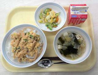 衣笠丼 みそドレサラダ すまし汁 牛乳