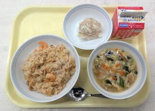 えびチャーハン 菊花しゅうまい たまごとわかめのスープ 牛乳