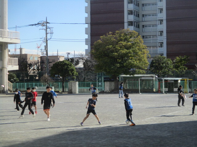 5校時の校庭には、サッカーを楽しむ最上級生の姿あり。