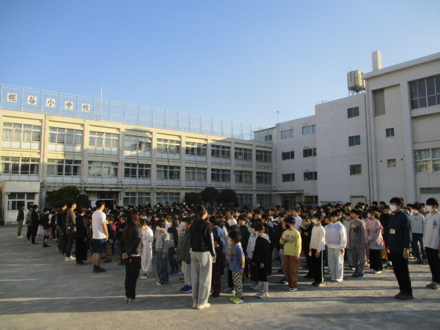 時間に余裕をもって、全クラスが校庭に集合できました。開始時刻まで、どのように待てばよいのでしょうか。もう、こどもたちは分かっています。体育座りをして、黙って待機できる集団へと成長しています。