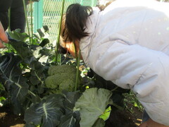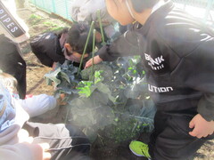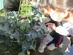 四組の下学年児童が、ブロッコリーの様子に興味深げです。目で見たり、手で触ったり、鼻で嗅いだり・・・。体感を働かせながら、詳細に観察を行いました。