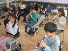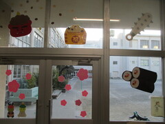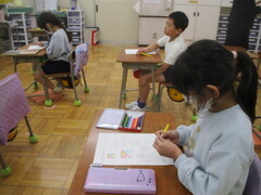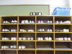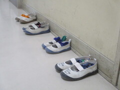 プレイルームで音楽の授業を受けているのは、四組下学年のみんな。楽しく活動する気持ちが、廊下にも伝わってきます。そして、もう一つ心が伝わってくるのが、整然と置かれた上履きです。靴箱で培われたよい習慣が、こういう場で発揮されてこそ本物と言えるでしょう。
