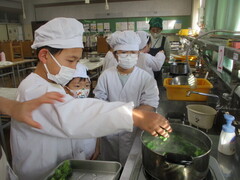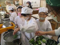 昨日に引き続き、四組の下学年はブロッコリーと過ごす時間が続いています。本日はブロッコリーの調理へ。茹でて、実食します。初体験の部分が多く、胸をワクワクさせている子がたくさん。