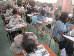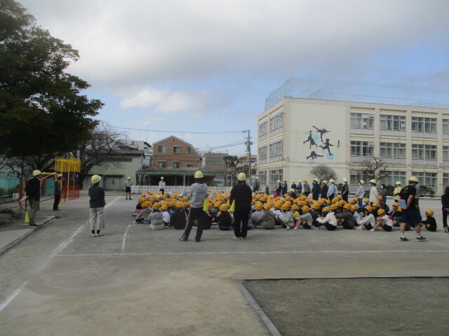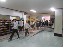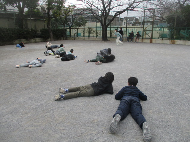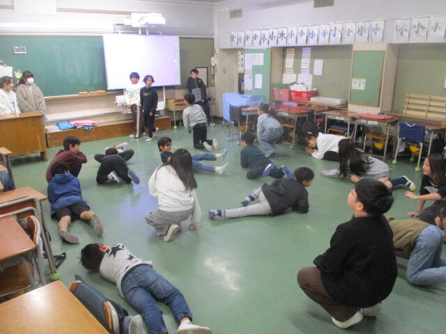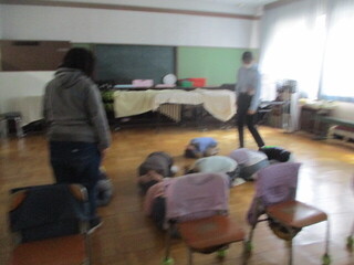 地震発生! その瞬間にすぐ身を守るポーズを取っている子たちが、素晴らしいです。画像は、四組の様子です。