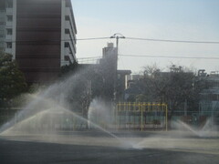 10m/sを超える北風が吹き荒れており、体感がガラッと変わりました。乾燥がひどく、砂埃が舞い上がっています。朝からスプリンクラーの出番です。
