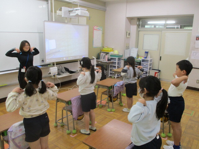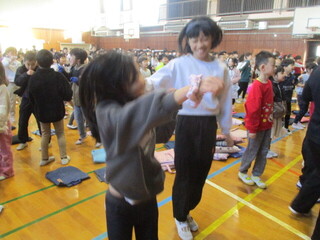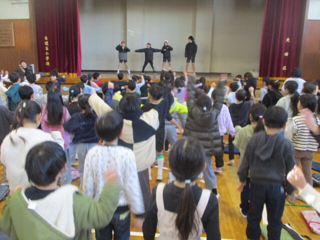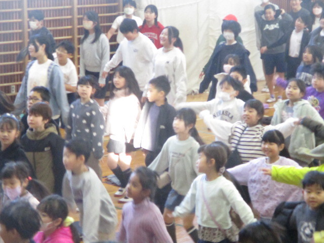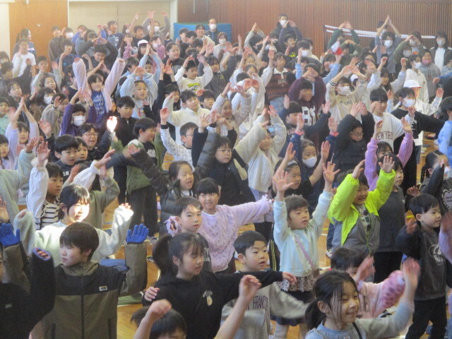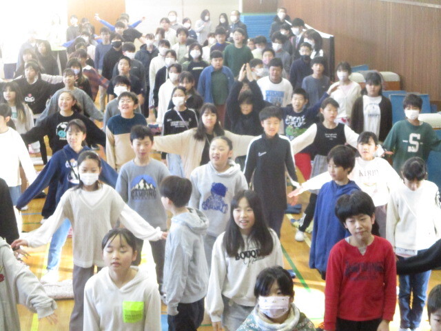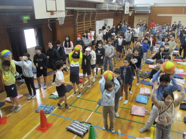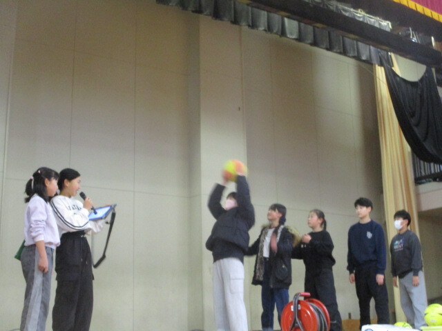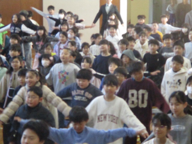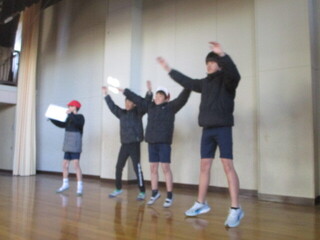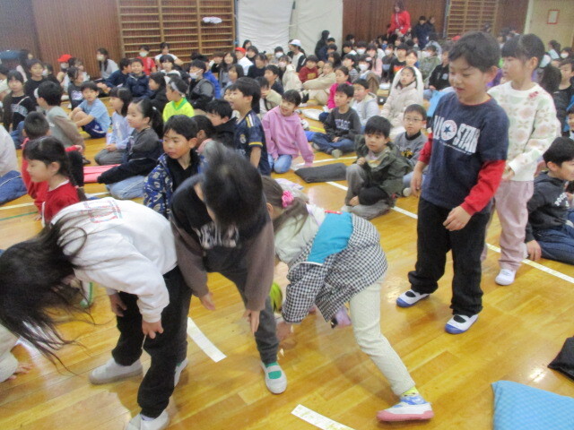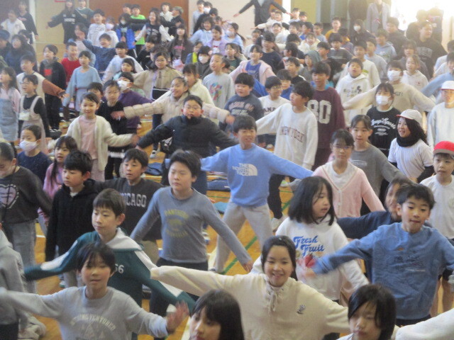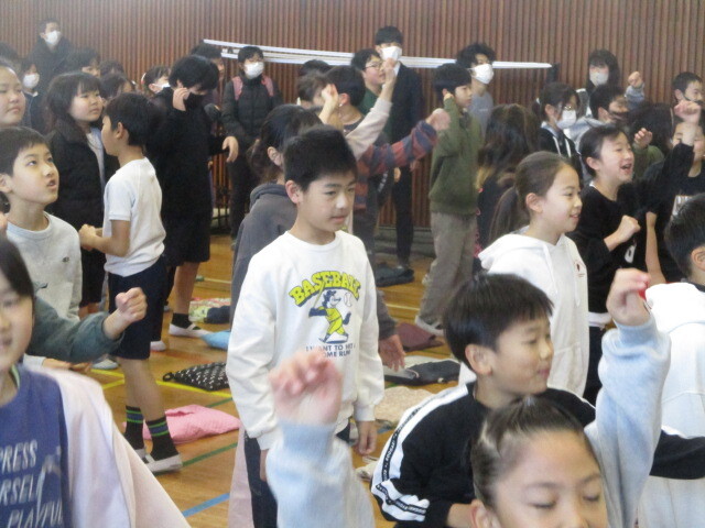 ジャンプマリオネットを行い、舞台上には示範役の6年生が立ちました。