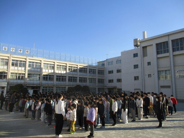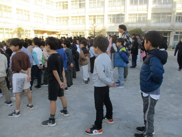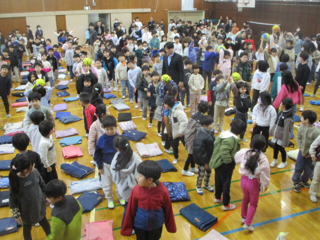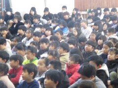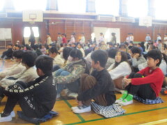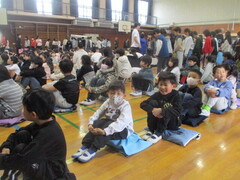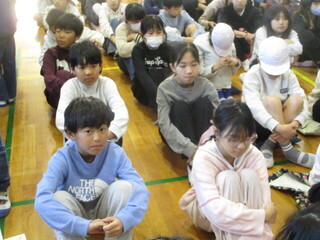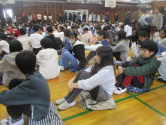 口を開かず、体育座りで集会の開始を待ちます。TPOをわきまえた行動を取れる小学生がいっぱいです。