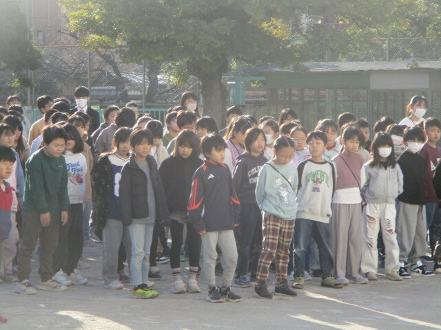 担任の引率のもと、まとまって定位置へやって来たクラス集団。立派な態度で臨んでいるこどもたち。司会役の先生から価値付けされ、100点をいただくことができました。3連休明けなのに、快い限りです。