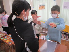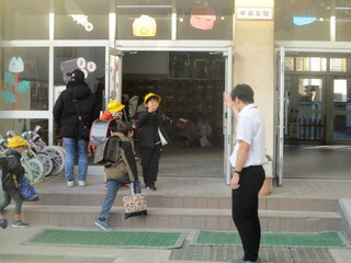 正門付近にはわくわくさん、昇降口付近には週番が立ち、登校して来た児童を挨拶とともに出迎えているいつもの光景です。ジャンケンをしていく1年生も見られました。(画像)