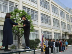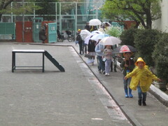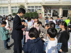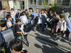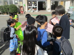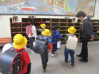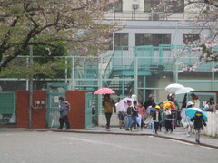 登校時間になりました。新一年生は親御さんや兄弟と一緒にやって来た子も少なくありません。「一人でも大丈夫!」と、安心できるようになるまでは、慣らし運転を繰り返していきましょうね。