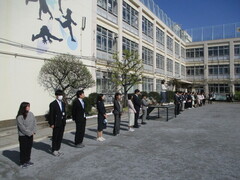 午前8時、教職員陣が各教室や昇降口で、登校して来た児童を迎え入れる体制を敷いております。「おはようございます!」の声とともに。