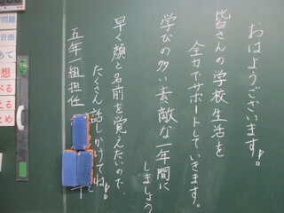 新学期のスタートに胸を弾ませているのは、こどもたちだけではありません。先生方も新しい出会い、クラスの始まりにワクワクしていますよ。教室の黒板に、その一端を見た思いがしますね。すてきな学級を全員で創り上げていっていってほしいです。