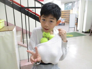 椅子の脚に装着するテニスボールの運搬を頼まれた3年生が、十数個と格闘中!