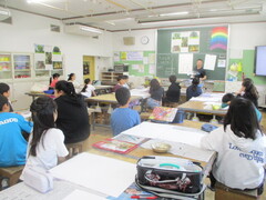3年生が楽しそうに外国語の活動をしています。今度のALTはお絵描きの達人! プロ顔負けの絵が紹介されると、その腕前に歓喜の絶叫が渦巻いていました。