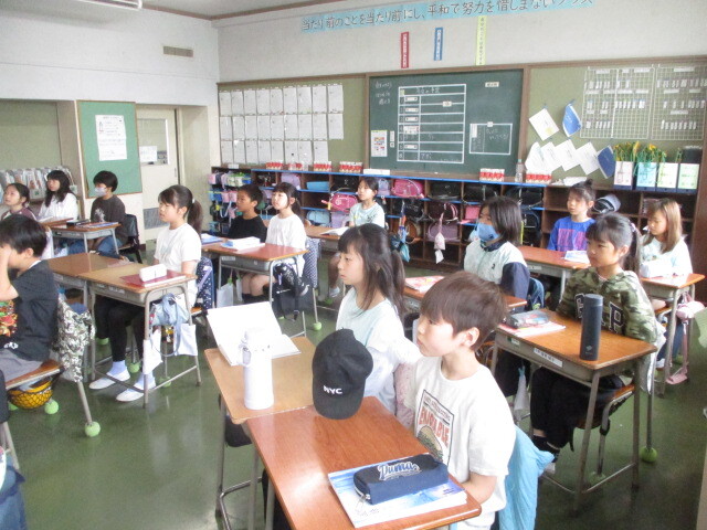 画像は、各教室で座り、話を静聴しているこどもたちの様子です。初めての1年生を含め、どのクラスも非常に落ち着いた態度で参加できており、感心しました。新学期3週目、このプラス面が学習においても発揮されることを願っています。