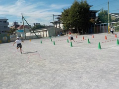 少し秋めいてきて、工程での体育も気持ちよく行える日が増えました。3年生は「小型ハードル走」の学習を行っています。小型ハードルはもちろん、箱や県ステップなど、いろいろなものをリズムよく走り越していくことに挑戦しています。物を置く感覚を工夫し、グループごとにオリジナルのコースを作ったり、ほかのグループのコースを楽しんだり、いきいきと取り組みました。