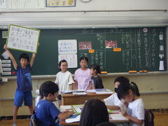 4年国語の授業です。作者はなぜ「一つの花」という題名にしたのか、話し合いをしました。作者が何を伝えたかったのかという視点で考え、意見を交流していました。