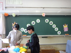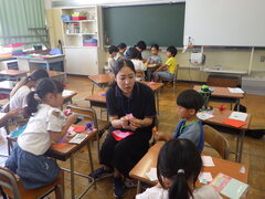 2年生が1年生の部屋を訪問しました。手には、大事に育てて最後にとった「あさがおの種」が入ったバッグを持っています。「早く学校になれてね」「学校はたのしいよ」など、一人一人が1年生に声をかけて、プレゼントしていました。2年生がすごくお兄さん・お姉さんに見えました。