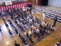 今日の音楽朝会では、全校児童が体育館に集まり校歌を元気に歌いました。そして、学年ごとにワンフレーズをうたうリレー唱を披露し、美しい歌声が体育館いっぱいに響き渡りました。