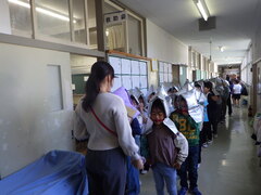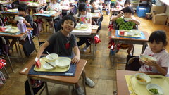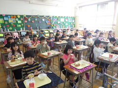 1年生が給食着を着て、初めての配膳に挑戦しました。トングをもって、笑顔でお友達にくばっていました。もらう子供たちは、お皿をしっかり持って、落とさないように慎重に歩く姿が、とてもかわいらしかったです。