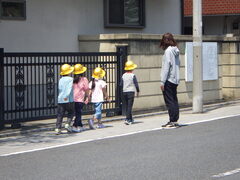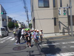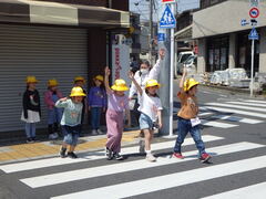 1年生が歩行訓練を行い、教育委員会の方のお話を聞いた後、実際に道路を歩いて、横断歩道を渡る練習をしました。左右をよく確認し、しっかり手を挙げてわたることを学びました。これからも安全に気を付けて登下校していってほしいです。