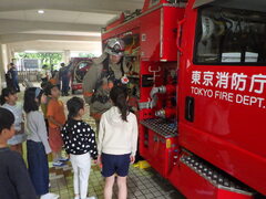 今日はあいにくの雨で、消防写生会はピロティでの見学になりました。消防士さんの話をじっくり聞きながら、間近で消防車を見られて、こどもたちはわくわくしているようでした。教室に戻り、写真を見ながら絵を描きました。本物のように大きくのびのびを描くことができ、まるで消防車が絵からとびだしてきそうでした。