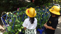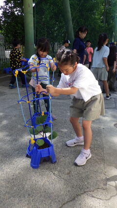 生活科で夏野菜を育てます。自分の好きな野菜を選んで、苗を植えました。今日は、今後の成長のために支柱を立てたり、写真で記録をとったりしました。これから、野菜の毎日の変化に気づき、大切に育てていってほしいと思います。