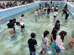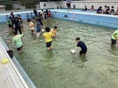 19日、月曜日5時間目、3年生はヤゴの救出に取り組みました。水泳指導が始まる前にプールに住むヤゴを救出し、トンボになるまで世話をするんだと張り切っていた3年生でしたが、ひざまで水につかって探しても、残念ながらヤゴを見つけることができませんでした。