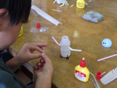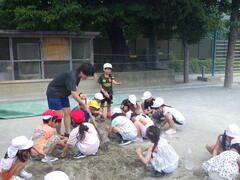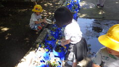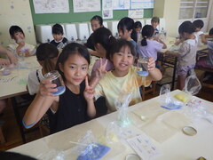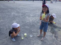 1年生が校庭で、自分たちで考えた水遊びをしていました。砂場で川づくり、道具を使って的あて、色水つくり・・・。水の心地よさを感じながら、大はしゃぎ。笑顔がはじけ、夏とのふれあいを思いきり楽しんでいました。